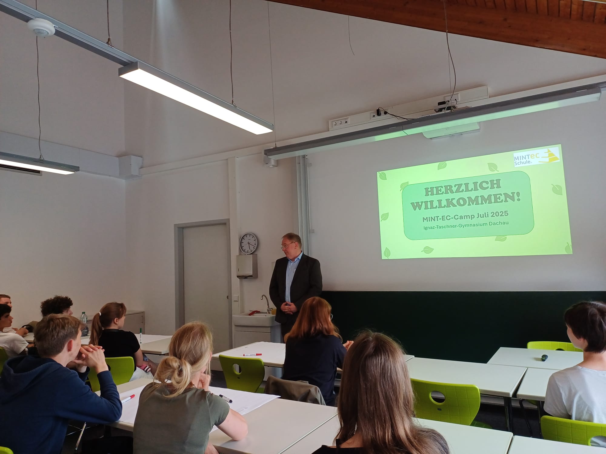 Der menschengemachte Treibhauseffekt stellt eine große Belastung für die Ökosysteme der Erde dar. Um zu verstehen, mit welchen Herausforderungen die Tier- und Pflanzenwelt unserer Erde durch den Klimawandel konfrontiert ist und welche Möglichkeiten die moderne Biotechnologie liefert, um diese negativen Effekte abzuschwächen, richtete unser Gymnasium vom 7. bis 10. Juli 2025 ein MINT-EC-Camp unter dem Leitthema „Das Problem Klimawandel und mögliche Lösungsansätze der Biochemie“ aus. Die viertägige Veranstaltung wurde vom P-Seminar Biologie unter der Leitung von Herrn Spiech aus unserer Fachschaft Biologie inhaltlich und organisatorisch vorbereitet und richtete sich an naturwissenschaftlich interessierte Schülerinnen und Schüler aus dem gesamten Bundesgebiet.
