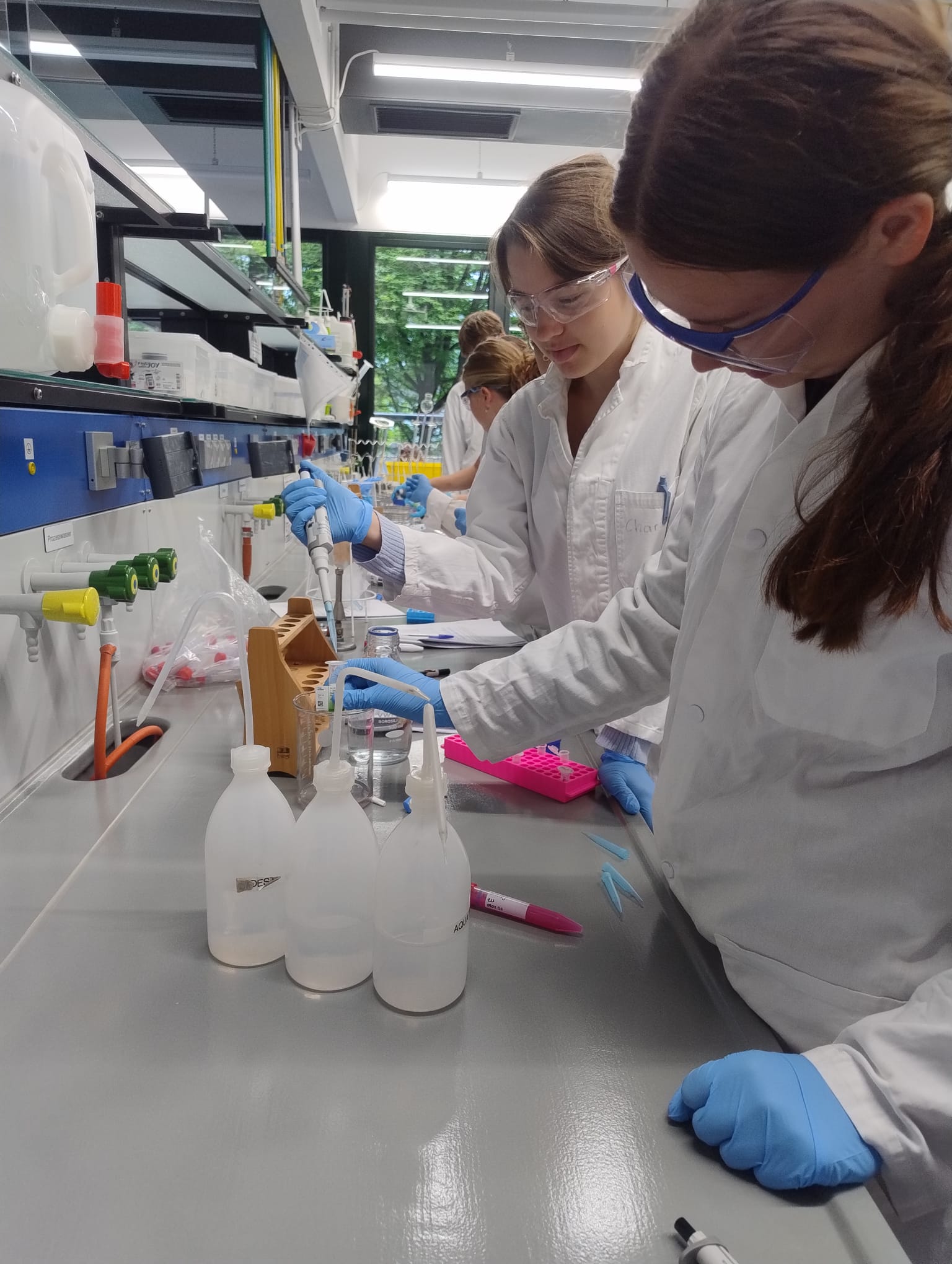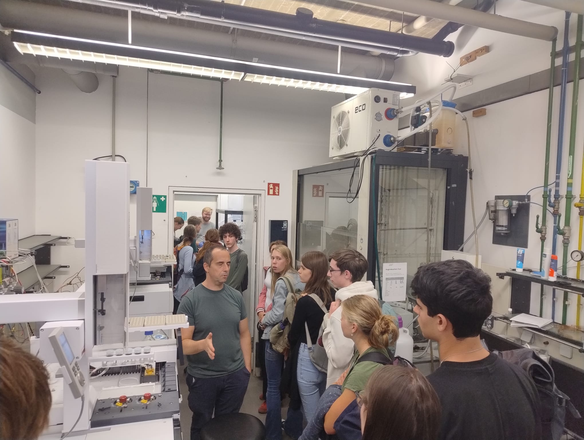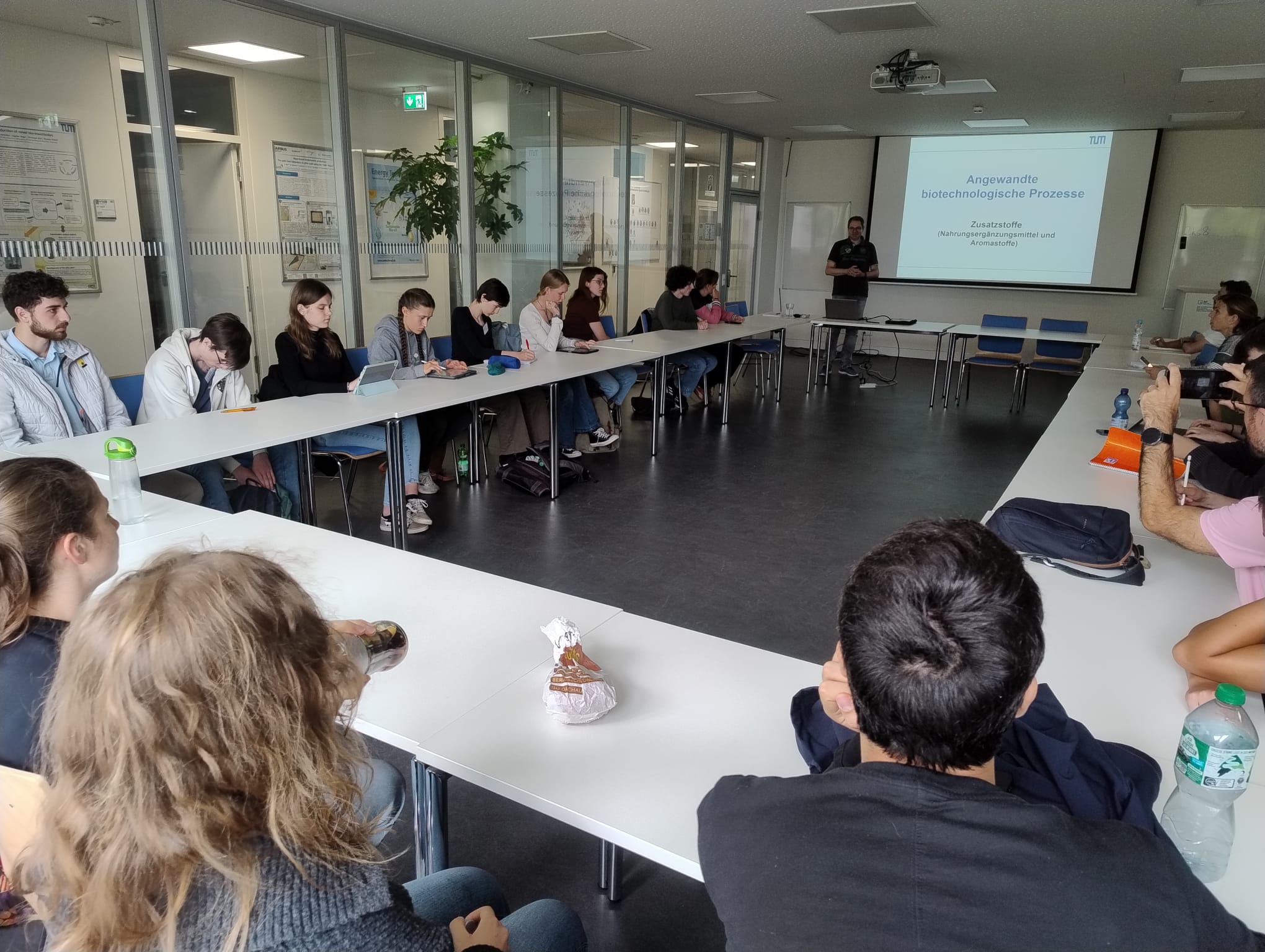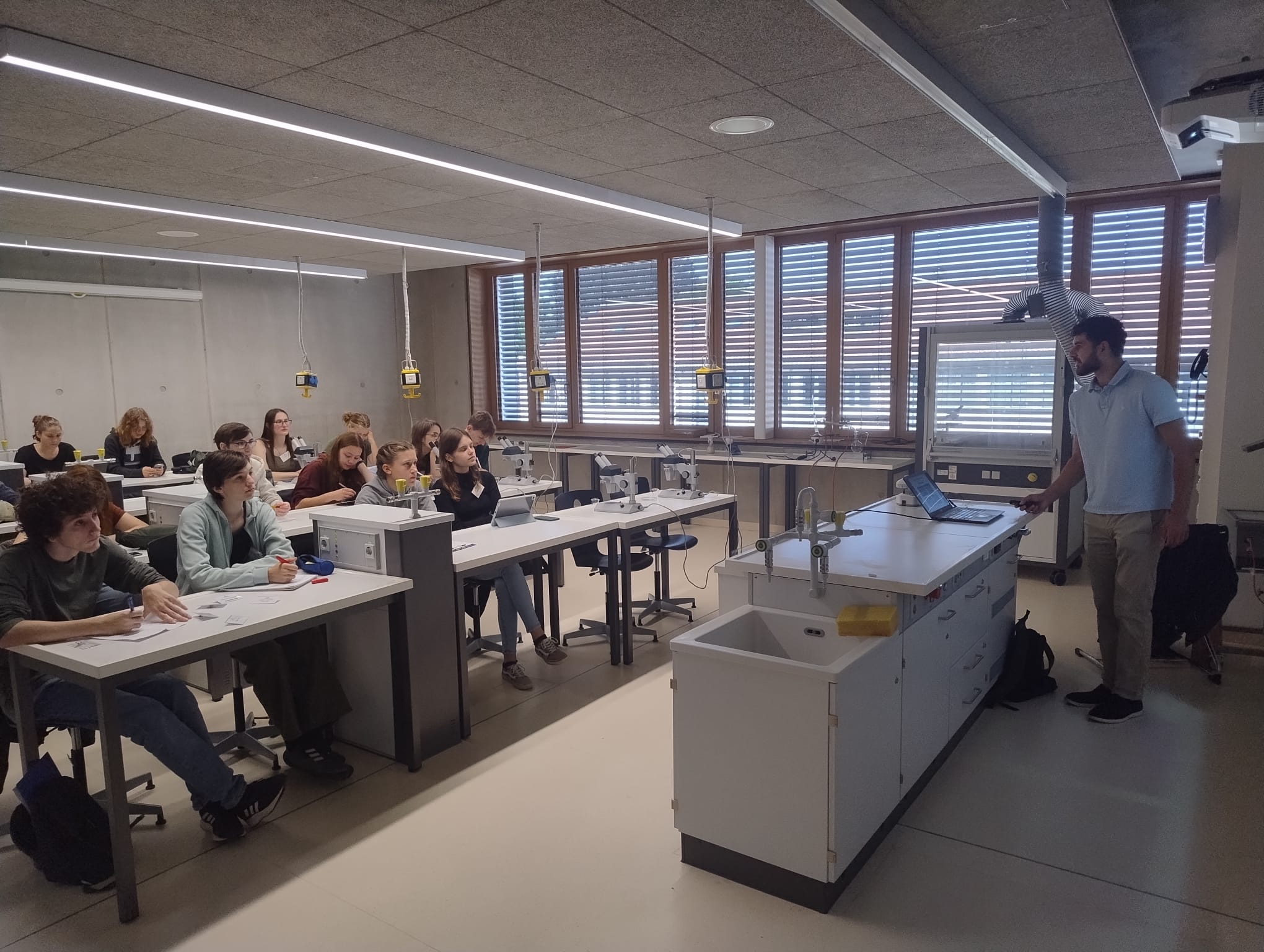 Der Mittwoch widmete sich biochemischen und biotechnologischen Lösungsansätzen für das Problem „Klimawandel“. Unser Schüler Benjamin Seldlmair stellte sein Forschungsprojekt zum Schwimmfarn Azolla vor, der als potenzieller CO₂-Binder und Biomasselieferant im Kampf gegen den Klimawandel eingesetzt werden könnte. Anschließend fand ein Workshop am Werner Siemens-Lehrstuhl für Synthetische Biotechnologie der TU München (Lehrstuhlinhaber: Prof. Dr. Thomas Brück) statt. Die Teilnehmenden lernten dort, wie gezielte Genmodifikationen zur klimafreundlicheren Produktion beitragen können. Der Tag endete mit einer Biotechnik-Mastervorlesung von Dr. Daniel Garbe sowie einer exklusiven Laborführung durch PD Dr. Norbert Mehlmer, die den Teilnehmenden einen Einblick in aktuelle Forschung und Technik der Biotechnik ermöglichte.